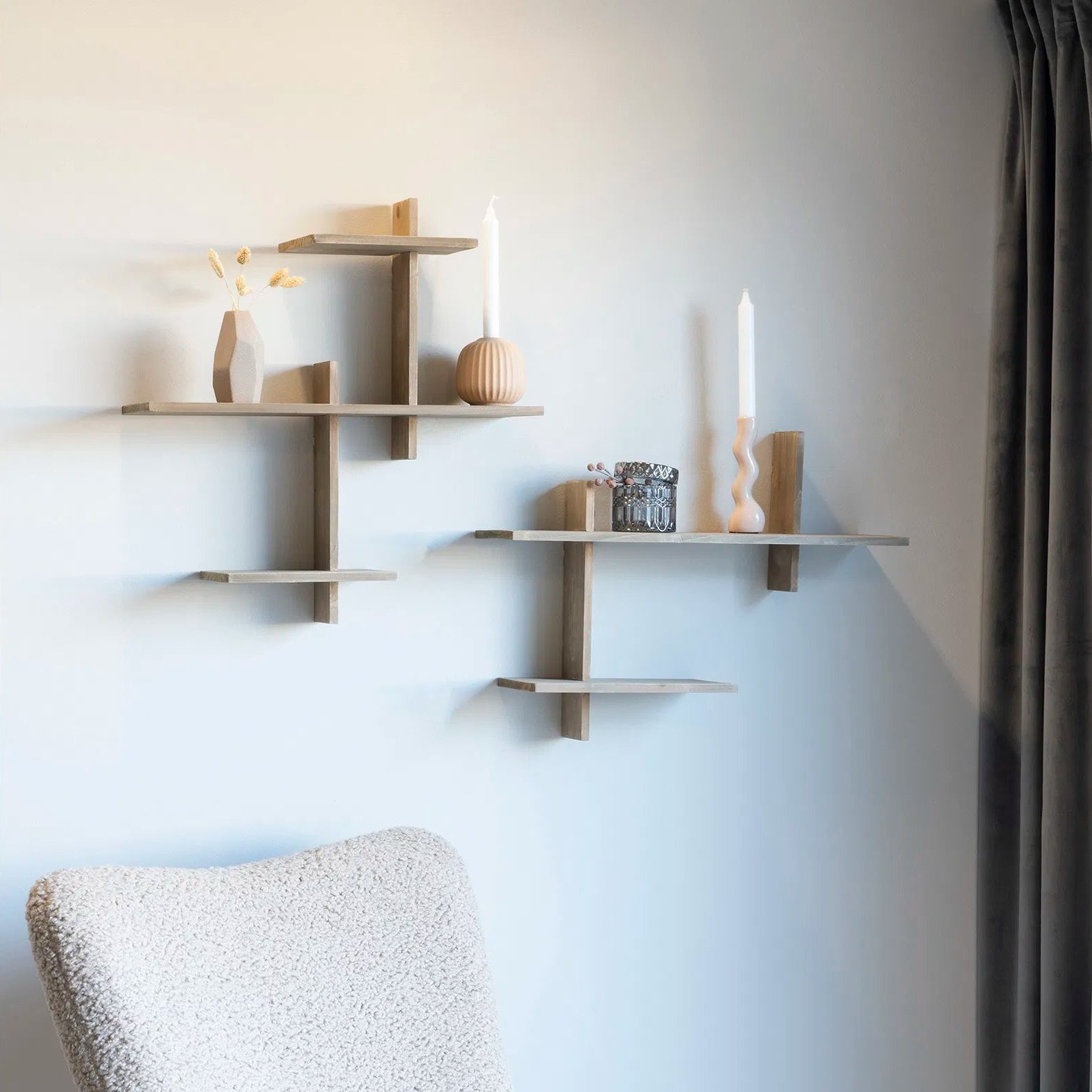 Hyldens forskudte niveauer skaber et roligt, arkitektonisk spil på væggen og giver plads til både dekoration og funktion. Astrid er ideel til at fremvise dine yndlingsting – bøger, keramik, små planter eller personlige fund – uden at virke tung eller dominerende i rummet.