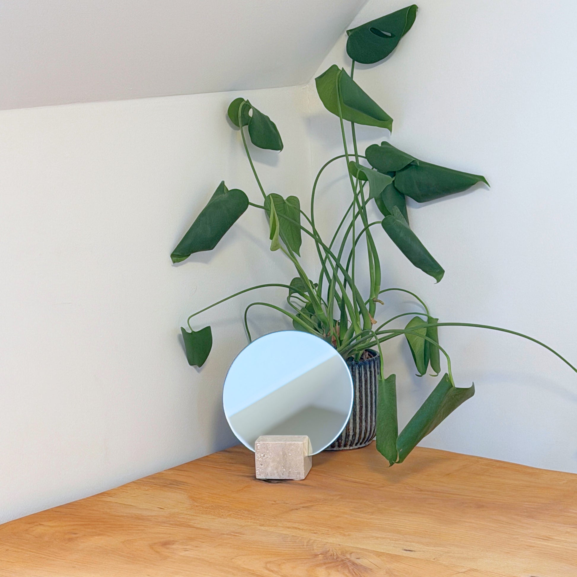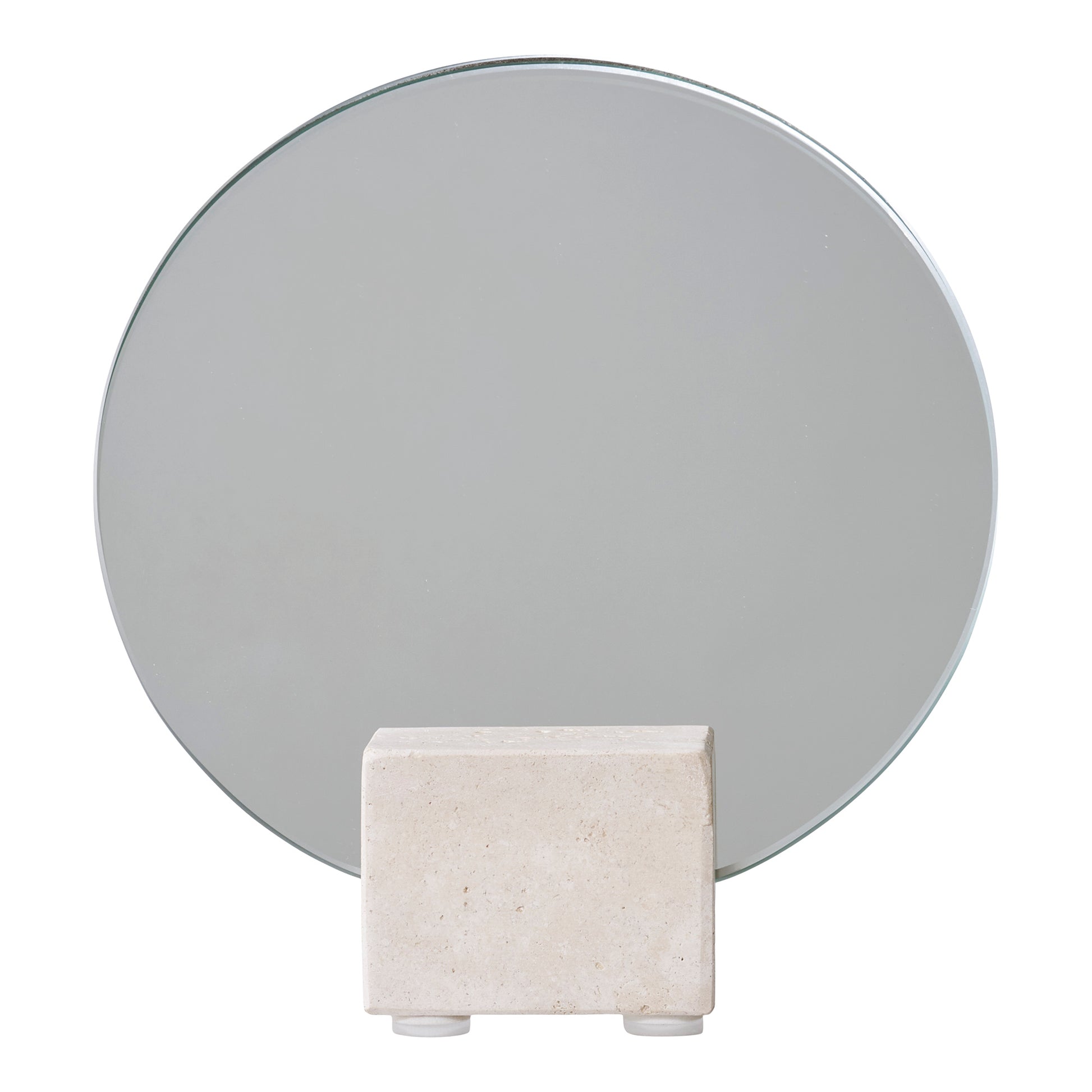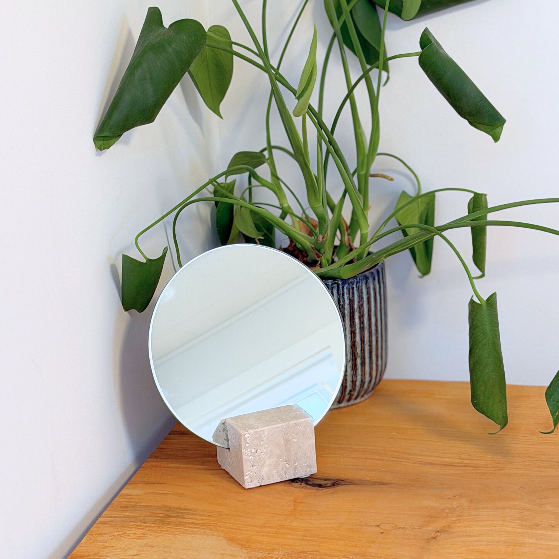 💕 Mød Aura – et elegant bordspejl i travertin og glas. Dette smukke spejl i beige nuancer skaber en rolig og harmonisk atmosfære i ethvert rum.