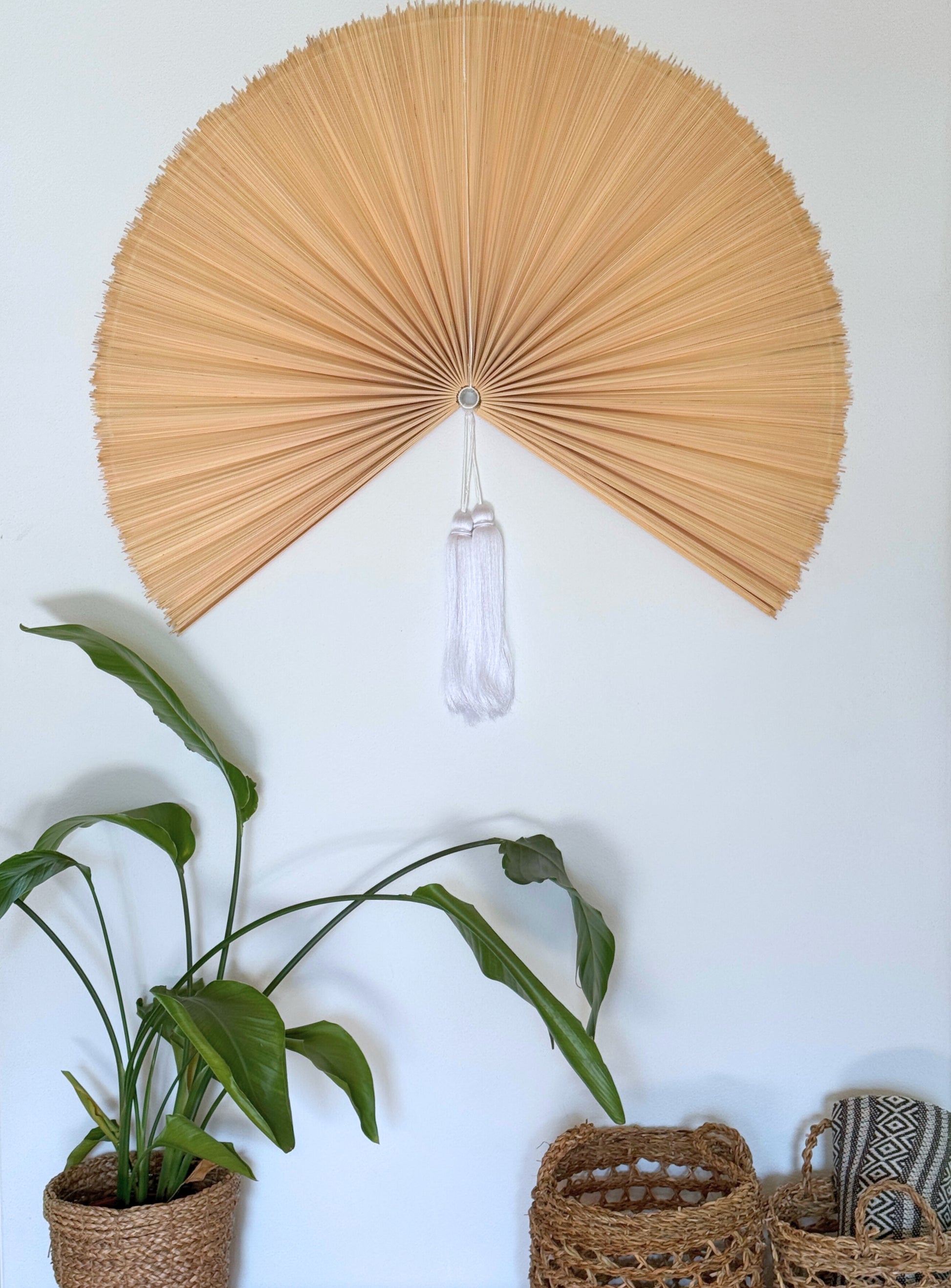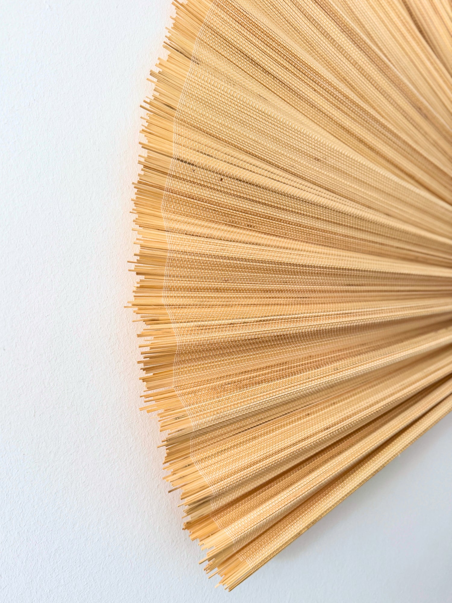 Saga bambusviften måler cirka 100 cm i diameter, når den er foldet ud og hænger på væggen.
