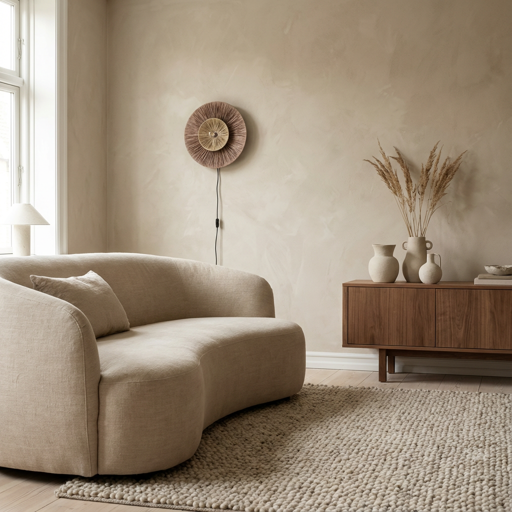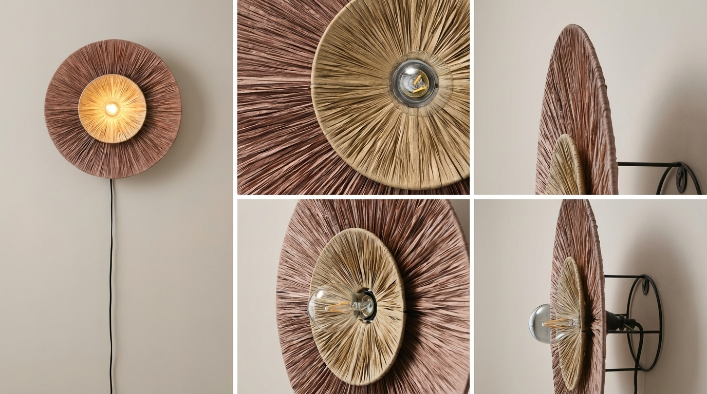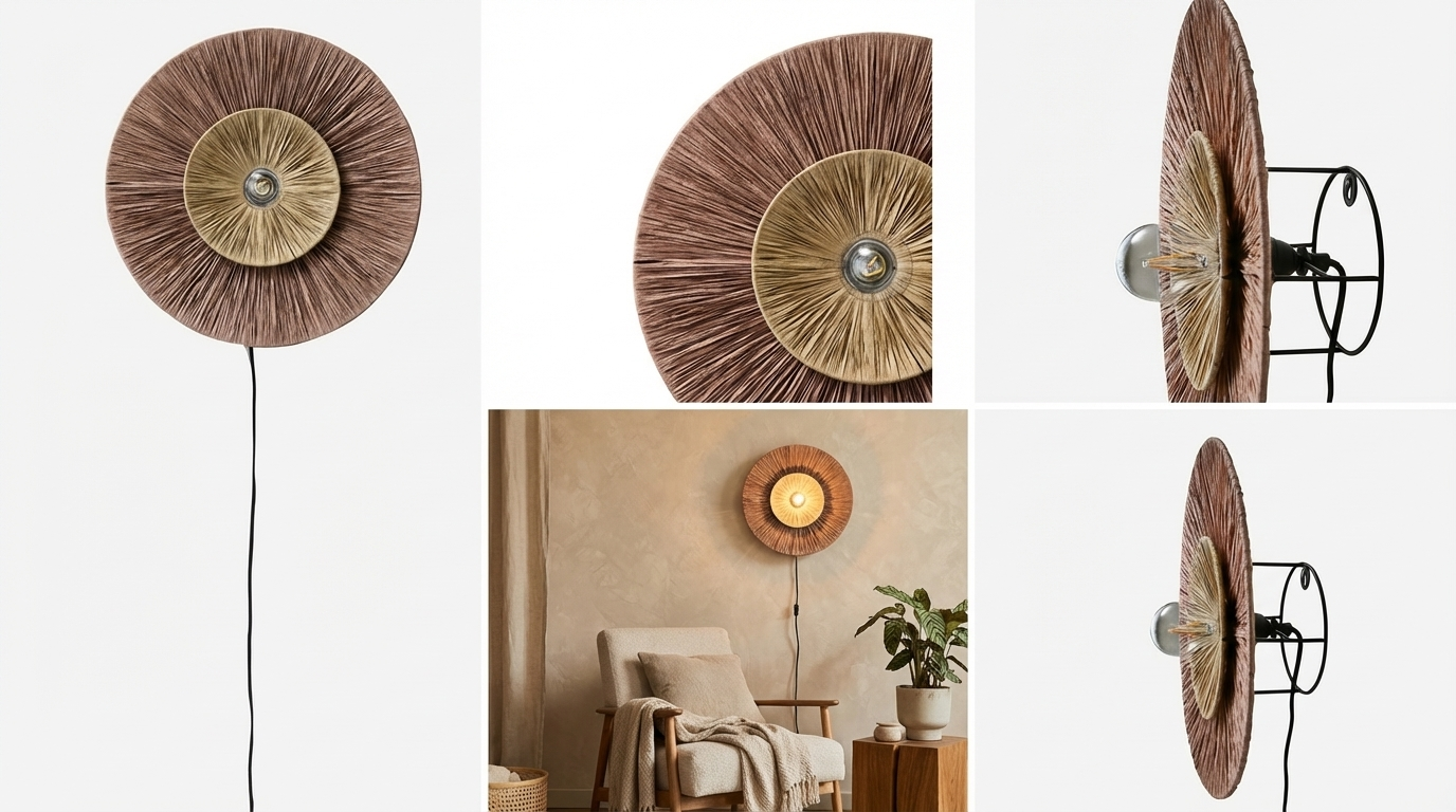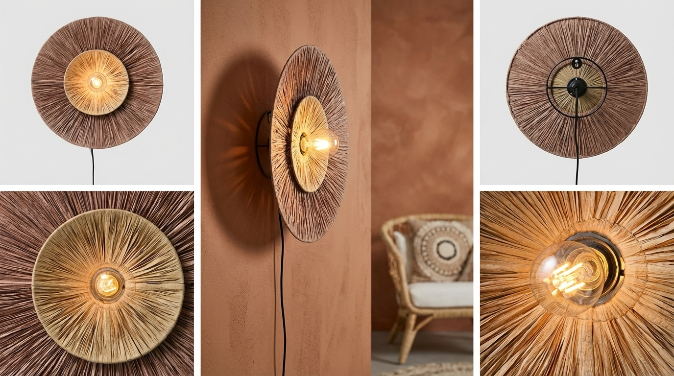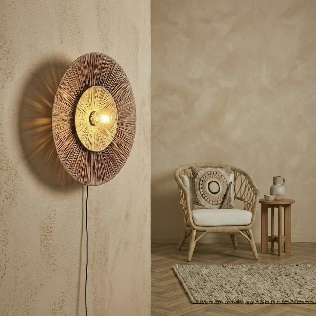 Raffiaskærmen fanger lyset og skaber et spil af skygger på væggen, der ændrer sig gennem dagen. Det naturlige materiale og den varme brun/naturlige nuance gør Luma til et element, der tilfører både funktionel belysning og dekorativ skønhed.