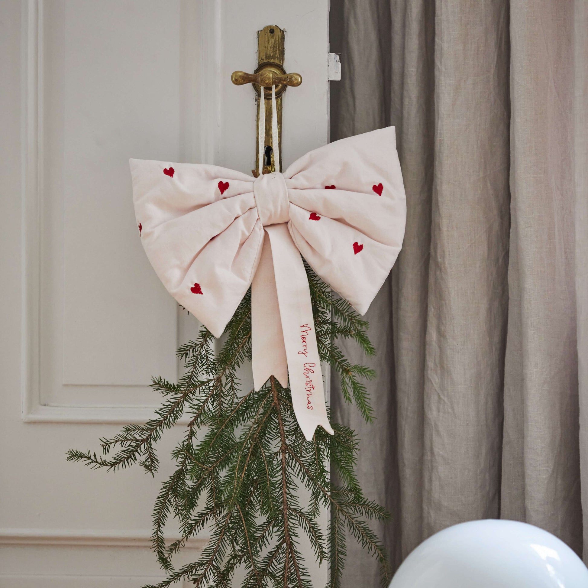 🌟 Forestil dig den hyggelige atmosfære, når denne charmerende sløjfe pynter dit hjem. Den bløde lyserøde farve kombineret med de broderede røde hjerter skaber en indbydende og klassisk julefølelse, som du vil elske at tage frem hver jul. 🎄