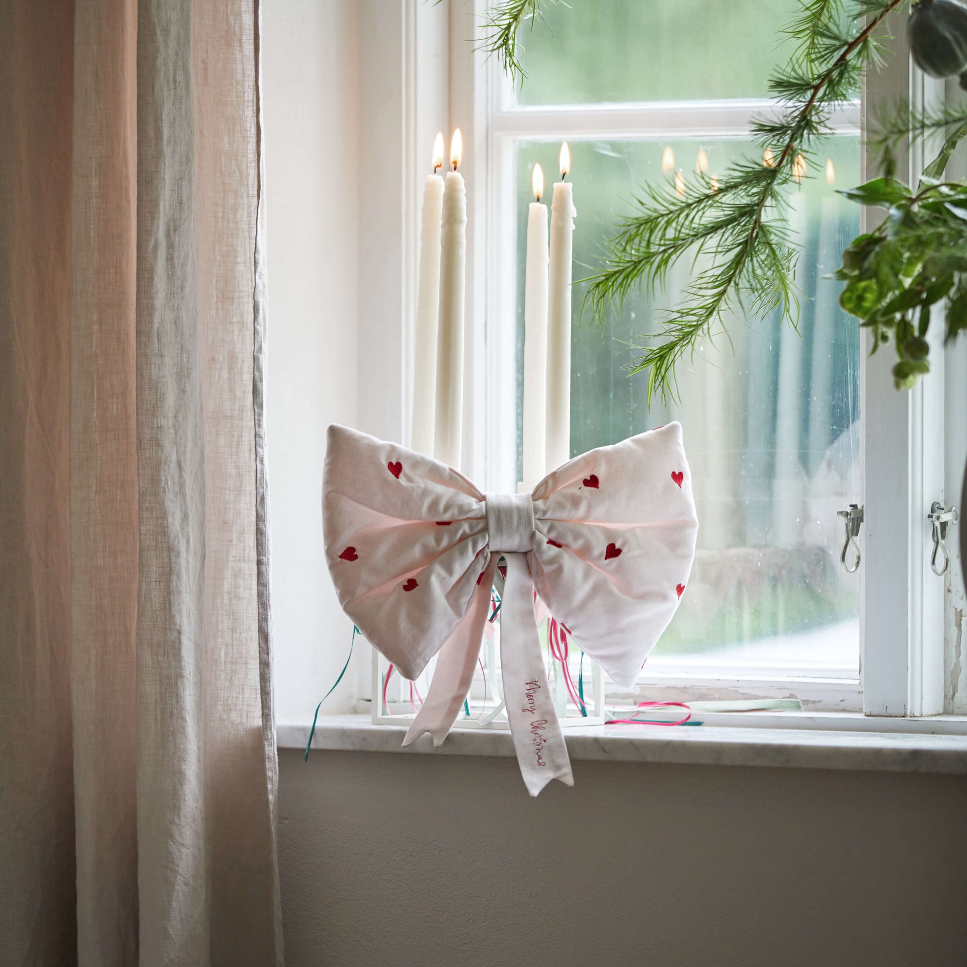 - 🎀 Polstret julesløjfe i lyserød med broderede røde hjerter – holder år efter år