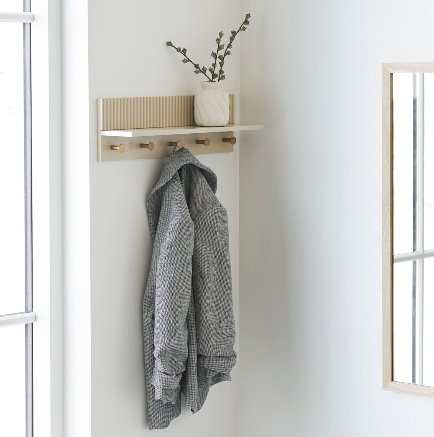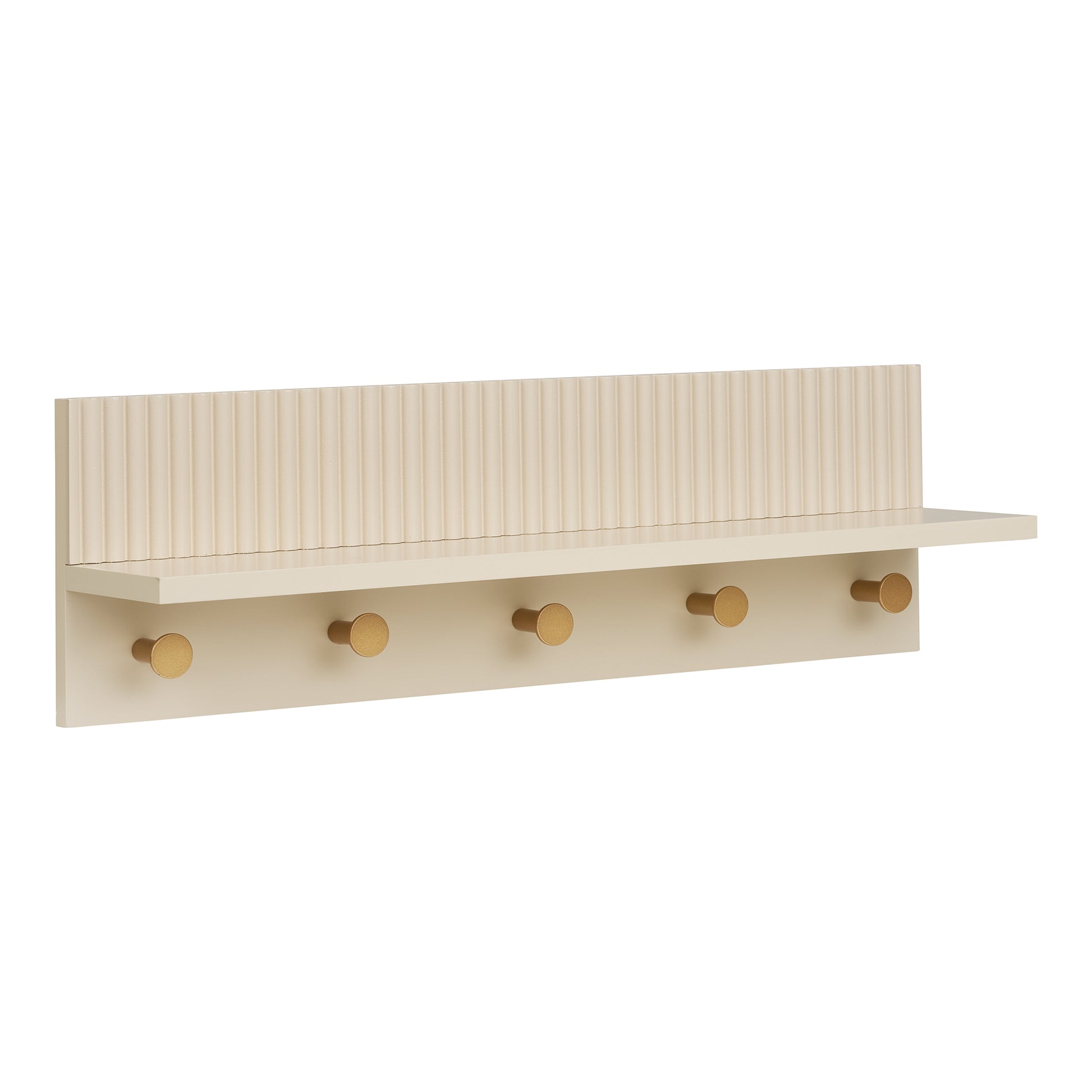 💕 Mød Sabbia – en enkel væghylde med knager, der kombinerer opbevaring og funktionalitet i ét smukt design. Denne praktiske hylde i beige nuance bringer nordisk ro og orden ind i dit hjem.