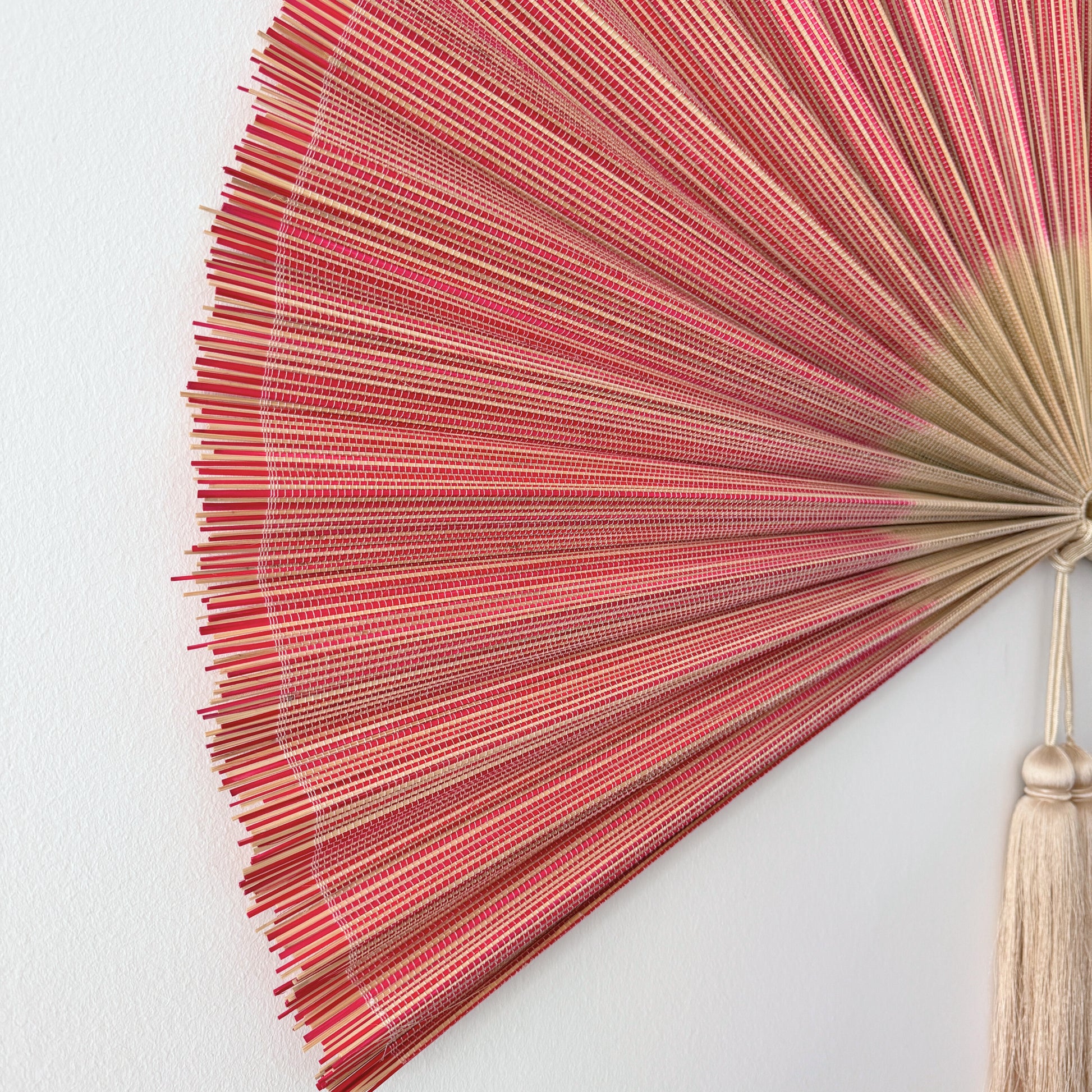 Saga bambusviften måler cirka 100 cm i diameter, når den er foldet ud og hænger på væggen.