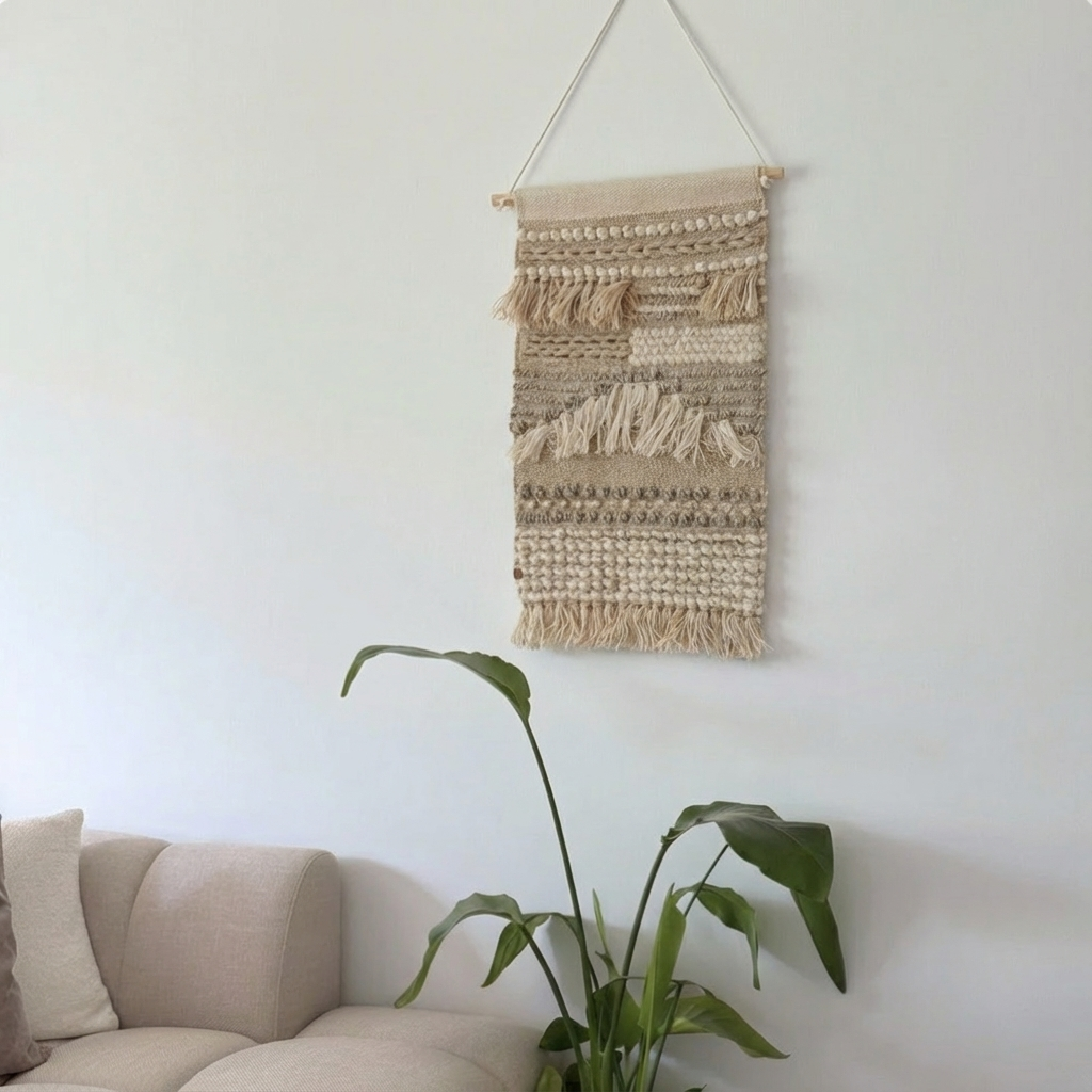 ✨ Mød Terra – et vævet vægtæppe i uld og bomuld, skabt til at bringe varme, tekstur og kunstnerisk udtryk ind på dine vægge. Terra har et håndværksmæssigt design med vævede mønstre og frynser i naturlige beige nuancer, der skaber dybde og karakter i rummet.